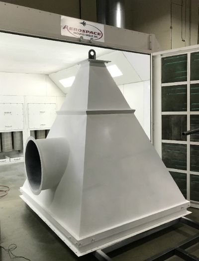 April 16, 2018: Aerospace Facilities Group 20-cartridge dust collector top section for the CH-47 Helicopter Abrasive Blast Booth project. The collector half is coating with our Thermal Tech Polymer coating.
