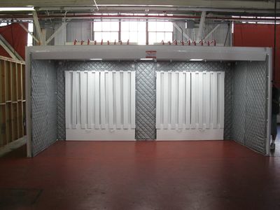 Sanding booth features and options include sound absorption panels, re-gain air to enhance capture velocity, sealed fluorescent lighting, high-efficiency, self-cleaning filters, modular expandable booths, HEPA after-filters, and built-in central vacuum systems.